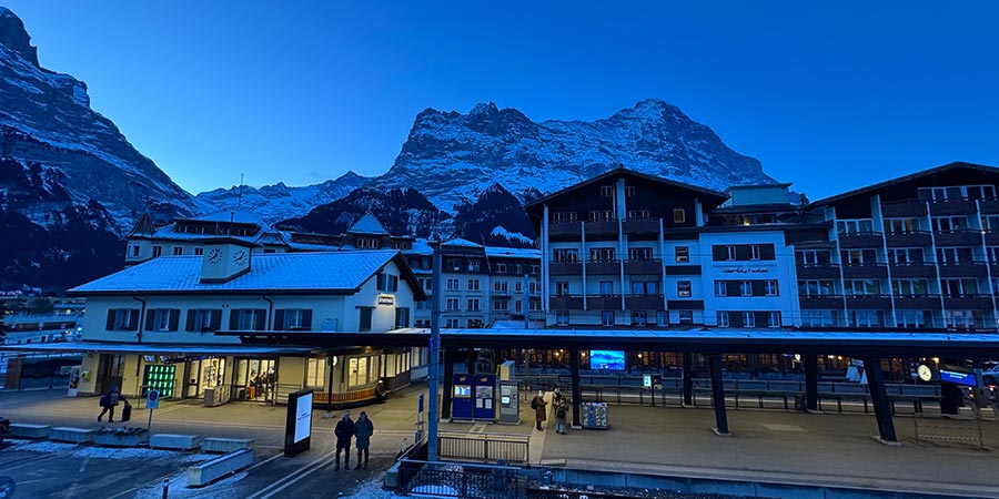 The day begins with a leisurely train ride from Interlaken into the nearby mountains, following the valley as steep slopes and dense forests close in around the line. Snow-topped traditional chalets with bells hung up for grazing cattle and frozen waterfalls create an increasingly alpine atmosphere as the train climbs towards the historic mountain resort of Grindelwald, framed by the imposing north face of the Eiger.